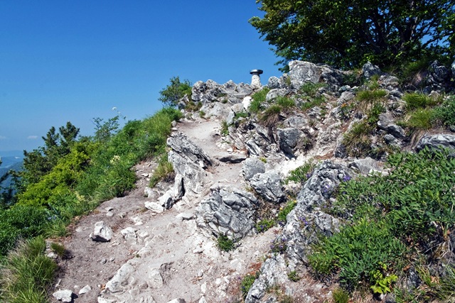 Po slabih treh kilometrih smo na razpotju. Naravnost so Gonte, po tej poti se bomo vračali, levo pa se začne strm odsek na vrh Grmade. Izvijemo se iz objema gozda in, tam, kjer je v nekaj ovinkih najtežje, pritisne še močno sonce. Če nam ne pade tema oči, se lahko med vzponom razgledujemo proti vzhodu, čez Sv. Katarino na Sv. Jakob in sosednji Jeterbenk, vrhova, ki sta že na medvoški strani Polhograjcev. V štiristo metrih se vzpnemo za dobrih sto metrov do razpotja, kjer se desno pot spusti proti Gontam. Od tam se že dobro vidi tamkajšnjo izletniško kmetijo, ki je odprta ob koncih tedna in praznikih, le nekaj korakov čez ostre skale oddaljeni vrh pa je naravnost.