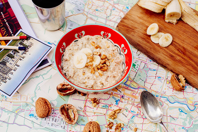 V posodo dajte ovsene kosmiče in mešanico vode in mleka, dodajte zmečkano banano, cimet, sol ter žličko sladkorja. Kuhajte toliko časa, da se kosmiči skuhajo in po potrebi dodajate tekočino (vodo ali mleko). Ko je kaša kuhana pustite, da se ohladi, nato pa jo po želji obogatite z beljakovinami v prahu, žlico skute ali grškega jogurta. Po vrhu pa posujte narezane oreščke in preostalo banano, ki jo razrežete na koščke.