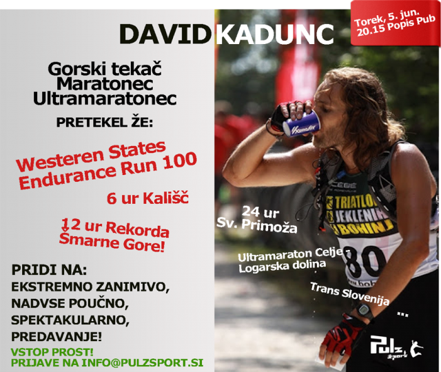 Pulz šport bo jutri za Bežigradom v tamkajšnjem Popis pubu gostilo predavanje ultramaratonca Davida Kadunca, ki se v kratkem odpravlja na ameriško celino, kjer bo že drugič tekel na Western States 100.
